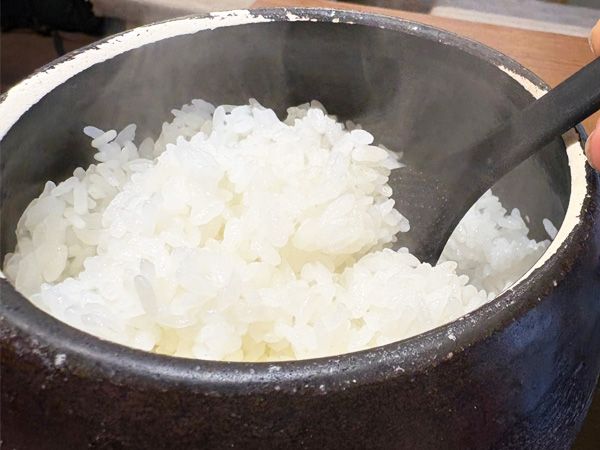 土鍋のふたを開けると米の香りが鼻をくすぐります。米の粒が立っているのがわかります。皿にご飯を取り分け、まずはご飯だけひと口。炊き立てのホフホフとした熱さと、米の甘み、固めに炊き上がっているので、食感もしっかり味わえます。お米だけでもおいしい!