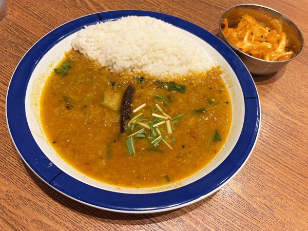 朝カレーは、3種類。今回は「サンバル(豆と野菜カリー)」を。サイドメニューとして「玉ねぎのアチャール」も頼みました。