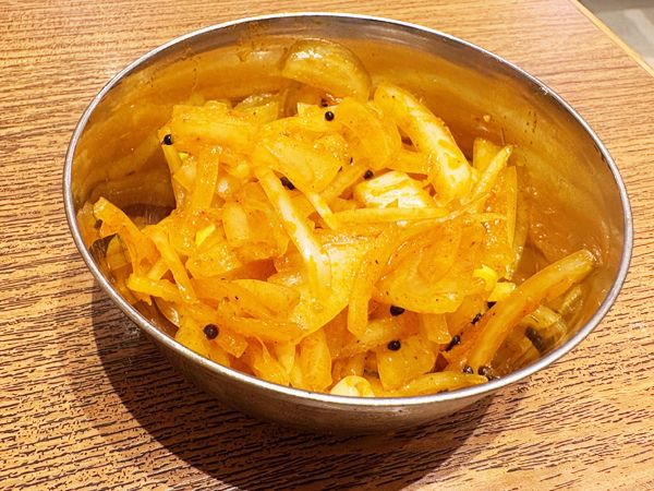 「玉ねぎのアチャール」は、タマネギの辛味がガツンとした味わい。これをカレーと一緒に食べると、スパイスの辛味にさらに深みが増しました。シャキシャキとした食感も良いアクセントになりました。