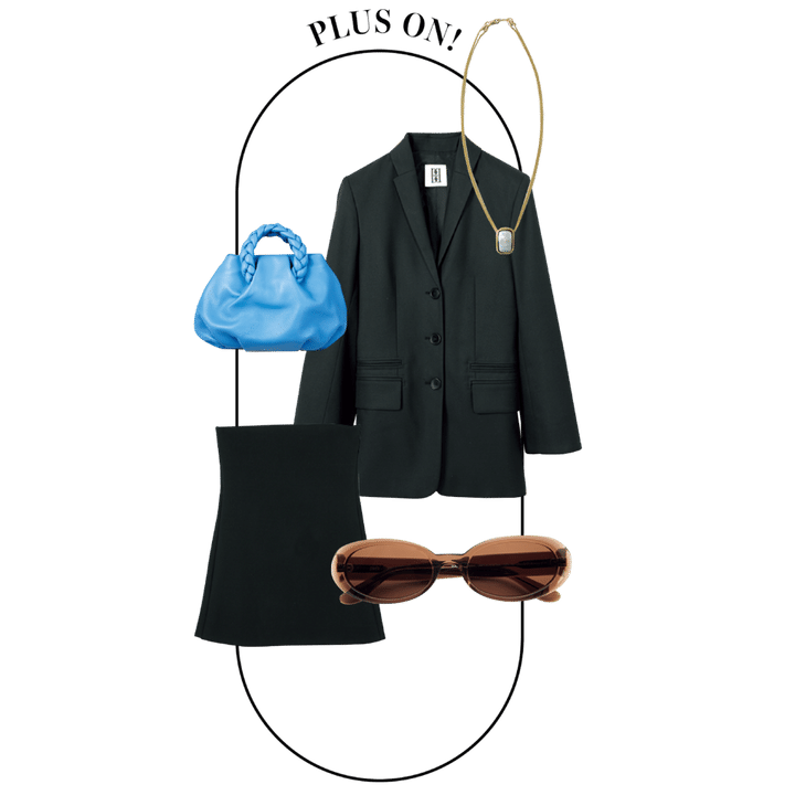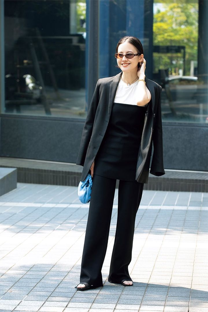白Tにパンツと同素材のベアトップを重ね、旬なムードに落とし込みました。ブルーのバッグやオーバル型のサングラスでモノトーンスタイルを華やかに。ジャケットは肩掛けにすることでこなれた雰囲気に仕上がります。