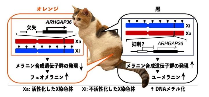 彼らは猫のX染色体上にある「ARHGAP36」という遺伝子領域に注目し、三毛猫のオレンジ色の毛に深く関係するDNAの変化を発見しました。