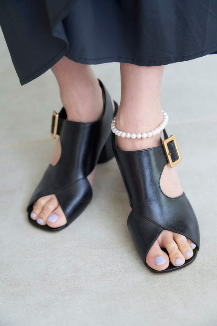 ゴールドの金具と大胆なカッティングのレザーサンダルは、フィービー期のセリーヌ。フェミニンなデザインのワンピースを着るときは、ハード系の靴で足元を引き締めるとスタイルがよく見えます。クールになりすぎないように、「シルクコードの淡水パールアンクレットで、甘辛ミックスのバランスをとりました」(内藤さん)