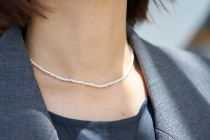 クールになりがちなモノトーンコーデに、大人の可愛さをプラスするのがパール。「極小パールなら、オケージョンっぽくならず、それでいて光とツヤをきれいにまとえます」(内藤さん)。ピアスもアンクレットもパールですが、それぞれ違うタイプのパールなので、こなれた感じになりました。