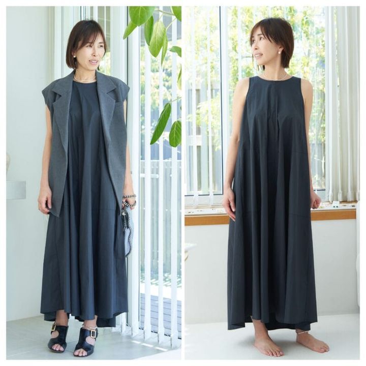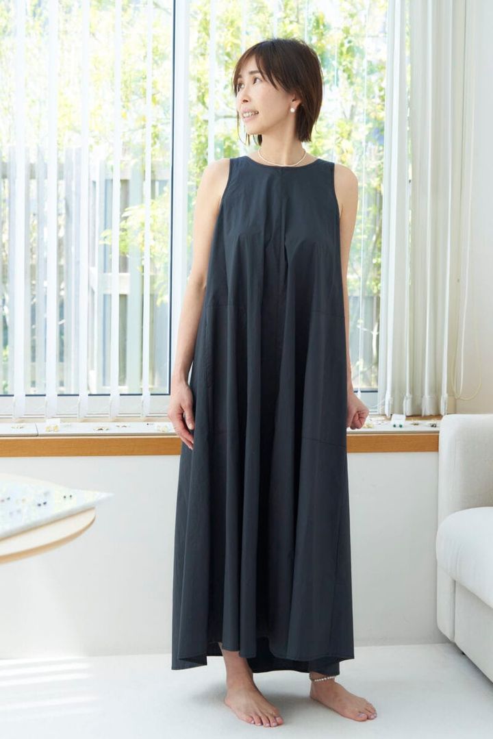 ノースリーブのワンピースなのに、肩や二の腕がきれいに見えるのは、バックにリボンがついたホルターネックとAラインのシルエットのおかげ。「たっぷりの布を使ったデザインなので、一枚で着てもボディラインが目立ちません」(内藤さん)