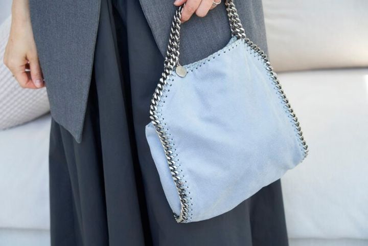 「何年か前に買ったスエード調のミニトートバッグは、ステラマッカートニーのもの。シーズンを通してヘビロテするお気に入り」(内藤さん)。ニュアンスのあるブルーが、クールなモノトーンコーデのアクセントになります。