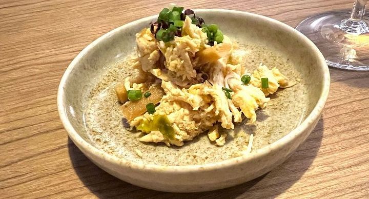 この日のお通しは、蒸し鶏とピリ辛ごぼうの味噌和え。