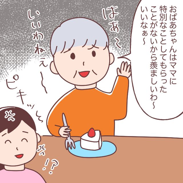 「おばあちゃんはママに特別なことしてもらったことがないから羨ましいわ~。いいなぁ~」しっかり自分の分のケーキを確保した状態で嫌味を言う義母に、私の中で怒りがまた増大したのでした。