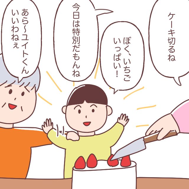 義母の言葉はスルーして、「ケーキ切るね」とケーキナイフを入刀しようとすると、「ぼく、いちごいっぱい!」とユイトくん。「今日は特別だもんね」そう言うと、「あら~、ユイトくんいいわねぇ」と横から義母が!