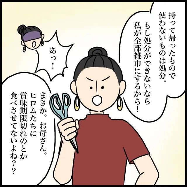さらに、「持って帰ったもので使わないものは処分。もし処分ができないなら私が全部雑巾にするから!まさか、お母さんヒロムたちに賞味期限切れのとか食べさせてないよね??」そう言われ義母は愕然。