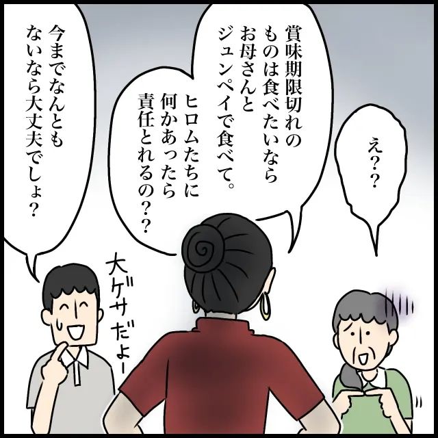 「え??」義母がそう言うと、「賞味期限切れのものは食べたいならお母さんとジュンペイで食べて。ヒロムたちに何かあったら責任とれるの??」義姉にそう言われたジュンペイが「今までなんともないなら大丈夫でしょ?大ゲサだよー」と呑気に答えました。