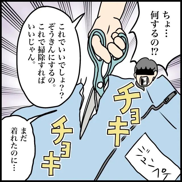 ハサミでチョキチョキ切り出したました!「ちょ・・何するの!?」義母が慌ててそう言うと、「これでいいでしょ??雑巾にするの。これで掃除すればいいじゃん」と義姉。「まだ着れたのに・・」と義母はもったいなさそうでしたが、