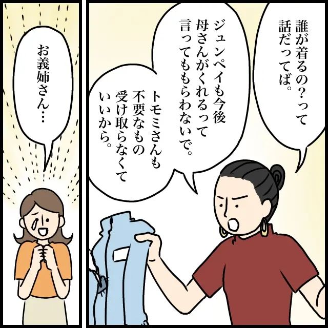 「誰が着るの?って話だってば。ジュンペイも今後母さんがくれるって言ってももらわないで。トモミさんも不要なもの、受け取らなくていいから」義姉の言葉に「お義姉さん・・」と感激する私。