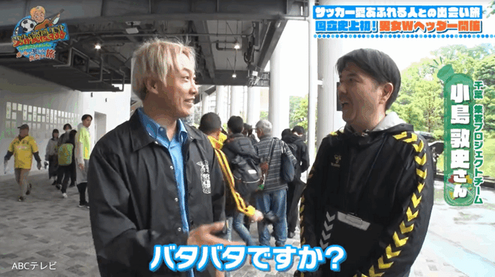 しんいちが国立競技場にやってきた目的は、女子のWEリーグと男子のJ2リーグの千葉-大宮ダブルヘッダーを取材するため。男女同日開催は、国立競技場において史上初だ。サッカーファン大注目の取り組みということで、早朝から運営スタッフは大忙し。そのうちの1人であるジェフユナイテッド市原・千葉のスタッフは、「普段のフクダ電子アリーナより規模が大きいので、かなり右往左往しながらやっています」と、しんいちに明かした。