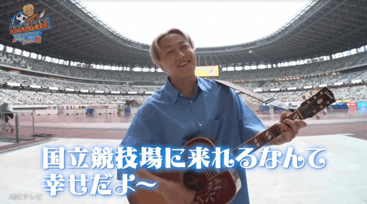 しんいちは、国立競技場へ来ることができた喜びを、お馴染みのギターの弾き語りでたっぷり表現! しかし最後には、「朝早すぎ~!」と、本音をこぼした。それもそのはず。しんいちが国立競技場に集合したのは、なんと朝6時30分なのだ。そのためしんいちは、「嬉しいですよ? 嬉しいですけど」と強調しつつ、「起きたばっかりやから、まだ顔の型も残っているし、枕の」「5時起き。前日夜1時まで仕事」と、不平が止まらなかった。