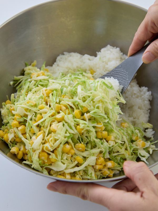 コールスローに使うキャベツは塩もみしてから、しっかりと水けを絞ります。こうすることでご飯に混ぜたときに水っぽくならず、味が薄まりません。