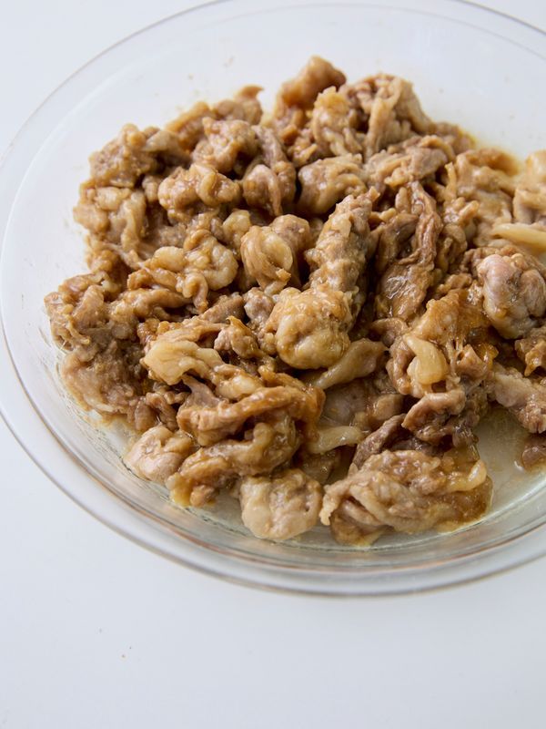 直径24cmくらいの耐熱皿に豚肉としょうがを入れ、片栗粉大さじ1、砂糖大さじ1/2、しょうゆ大さじ1と1/2、みりん大さじ1、こしょう少々を順に加えてよくもみ込む。ふんわりとラップをかけて電子レンジ(600W)で4分加熱し、取り出して全体をよく混ぜ合わせる