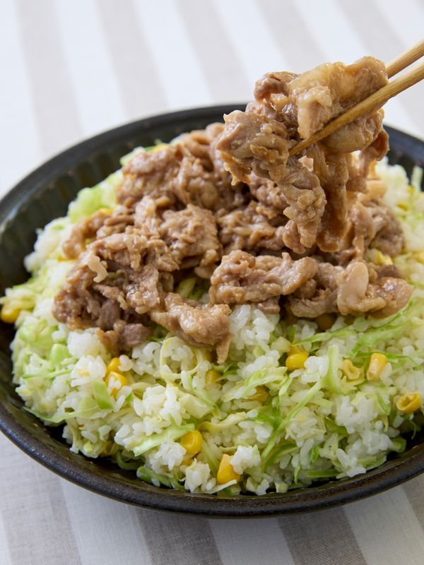 あれこれおかずを作る気力がないというときに頼りになるのが、具の下ごしらえがラクチンでパパッと仕上がる、食べごたえ満点のおかず混ぜずしです。そこでご紹介するのが定番の肉おかず「豚のしょうが焼き」をレンチンで仕上げてトッピングする、のっけ系混ぜずし。ご飯にコールスローを混ぜ込めば、ほどよい酸味で食がすすむだけでなく、野菜もたっぷりとれて大満足です。