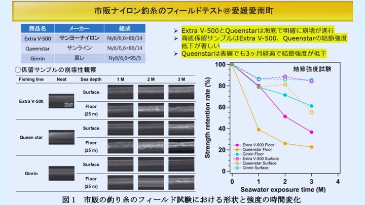 こうして明らかになったのは、特定の市販ナイロン糸が、実際の海の中でも想像以上に早いスピードで分解されているという衝撃的な事実です。