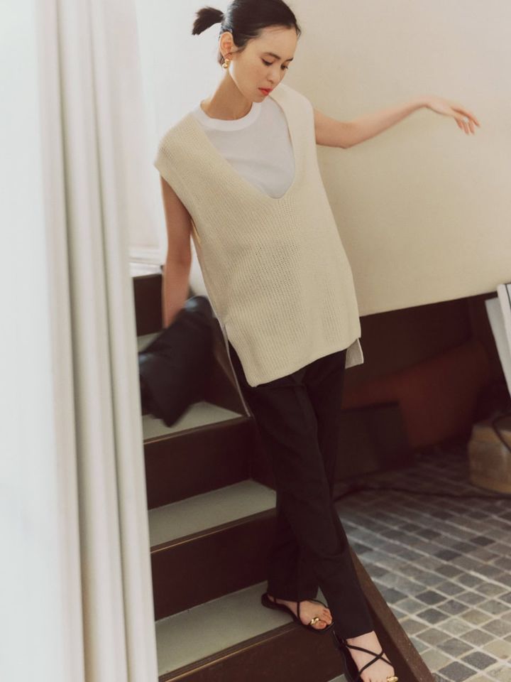 Tシャツ¥13,200、ニットベスト¥53,900、パンツ¥59,400(全てエイトン/エイトン青山)、バッグ¥198,000(J&M デヴィッドソン/J&M デヴィッドソン カスタマーセンター)、サンダル¥14,300(ル タロン グリーズ/ル タロン グリーズ ルミネ新宿店)、ピアス¥11,990(ラブ・エージェイ/ズットホリック)