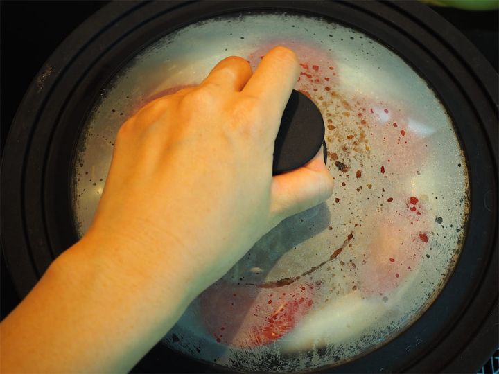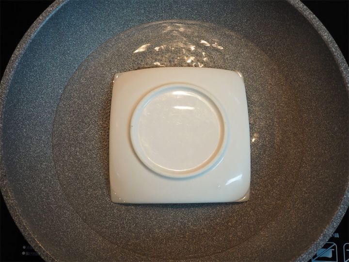 8. 平べったいフライパンに薄いザルを入れ、底から1cm程度の水(分量外)を入れ沸かし、その上に7のお皿を乗せフタをしたら8分蒸していく。