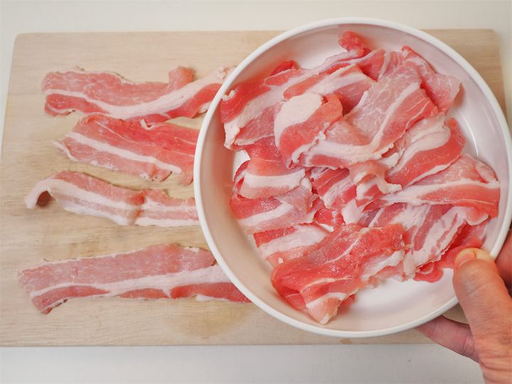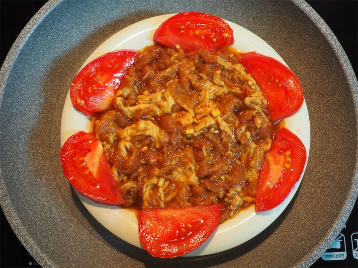 火の通りが一定になるように、豚肉はなるべく平らにしながら盛り付けるのがポイント。