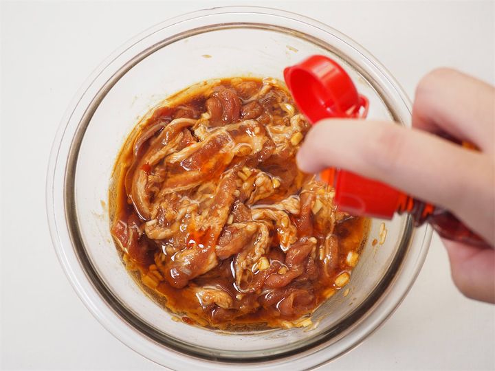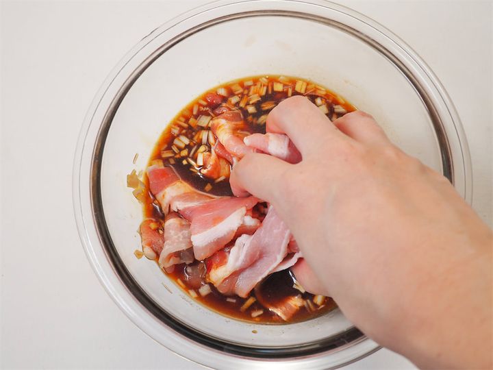 4. 31の豚肉を入れ、揉むようにして味を染み込ませていく。