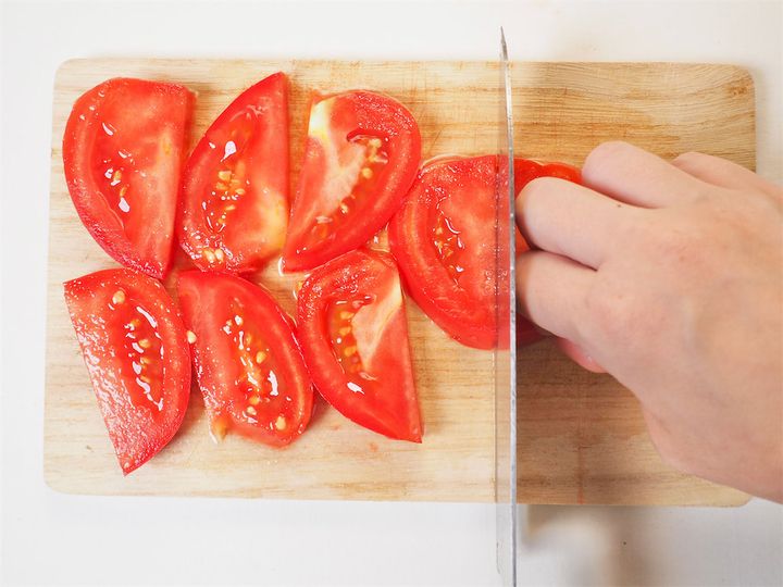 2. トマトを輪切りにし、さらに半分に切って半月切りにする。