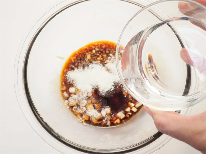 3. ボウルににんにく、しょうが、長ねぎ、しょうゆ、豆板醤、甜麺醤、チキンパウダー、砂糖、水を入れ混ぜ合わせて調味液を作る。
