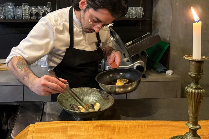 魚料理は、プロヴァンス風のブイヤベース。魚を焼く心地よい音と、トマトのよい香りが広がります。美しく盛り付けられていく様子を目で味わえるのは、カウンター席だからこそ。
