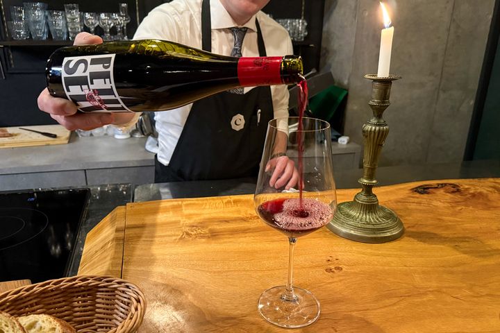 ワインは、今回の肉料理に合う「プチ・セルヴ・ルージュ」をセレクトしていただきました。深みのある味わいながら、さわやかさとのバランスがよく、料理と一緒に飲みやすい赤ワインです。