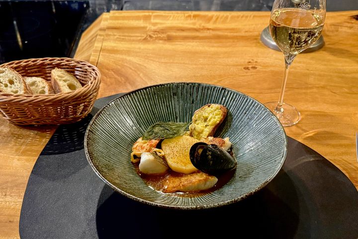 魚のだしをベースにシャンパンとトマトが使用されているソースは、まさにうま味が凝縮した味わい。シャンパンを加えることで、軽やかな風味に仕上がっています。一緒に提供されるバゲットをソースに浸すと、また違った味わいに。