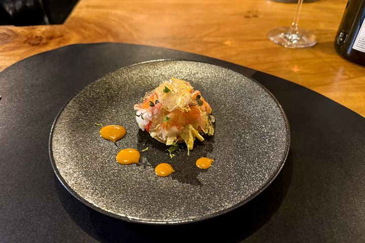 ホタテとフランス産オマール海老、セロリのサラダがサクサクのパイの上にのっています。さらにシャンパンをぜいたくに使ったジュレがトッピングされ、輝いています。