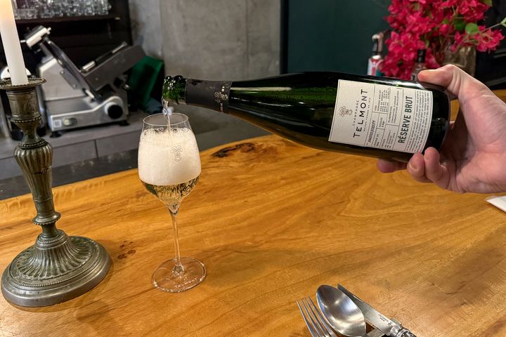 1杯目には、おすすめのシャンパン「テルモン レゼルヴ ブリュット」をオーダー。シャルドネ、ピノ・ノワール、ピノ・ムニエといったブドウが使われています。きめ細やかな泡が美しく、なめらかな口当たりとフレッシュな風味が魅力です。