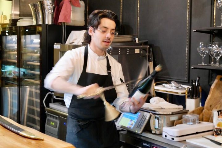 今回体験したのは、サーベル(刀)でシャンパンを開ける伝統的なパフォーマンス「サブラージュ」をテーマにしたディナーメニュー 9900円。「サブラージュ」を世界中に広める「サーブルドール騎士団」の日本大使であるベルナール・アンクティルシェフの考案で、シャンパンを使用した料理や、シャンパンに合う料理が用意されています。
