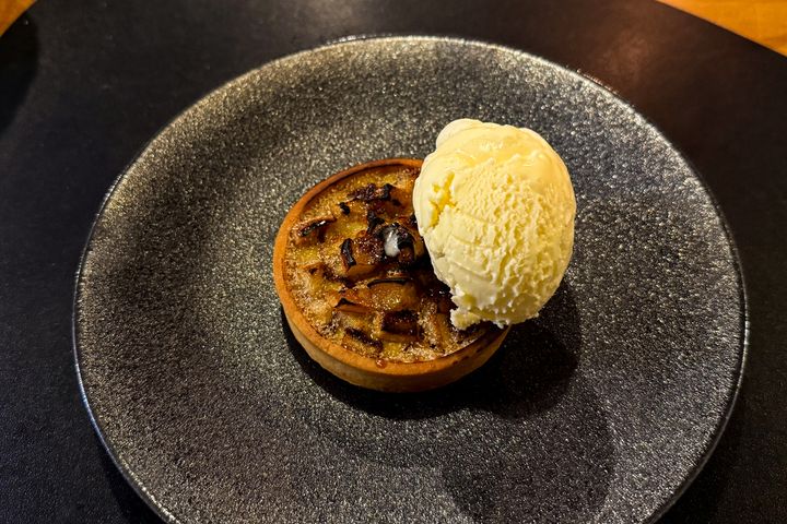 リンゴはカルバドス酒でソテー・フランベされており、大人な味わい。濃厚なバニラアイスをリンゴタルトと一緒に食べると、さらにぜいたくな気分に。最後までこだわりの詰まったメニューで、満足感たっぷりです。