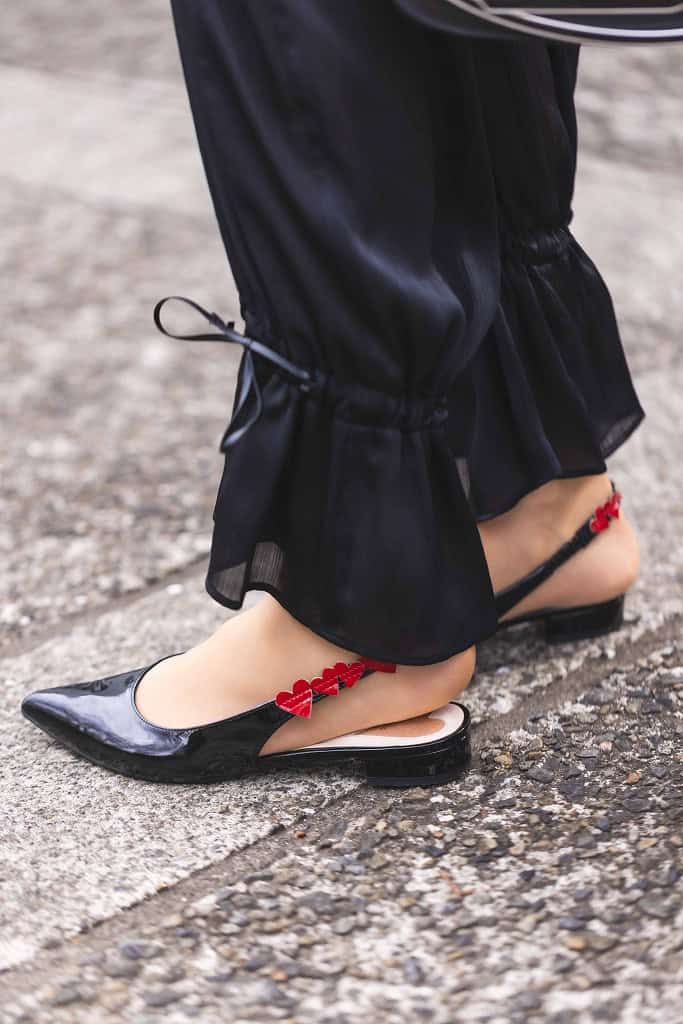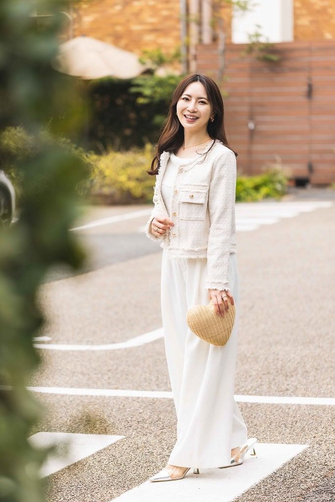 ハートのラタンバッグは清涼感もあり、これからの季節にピッタリ。コロンとしたハートの形が友達からも褒められるアイテムです。バッグの存在感が強いので、コーデは統一感のあるカラーでシンプルにしました。靴は、シルバーパンプスを合わせ涼しげな印象の足元にしました。