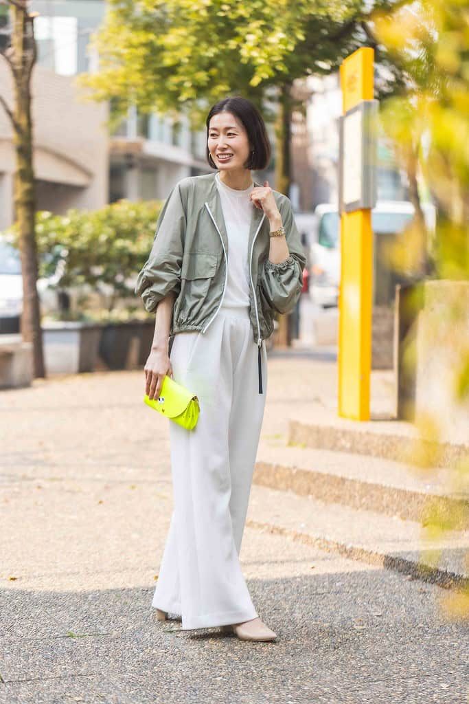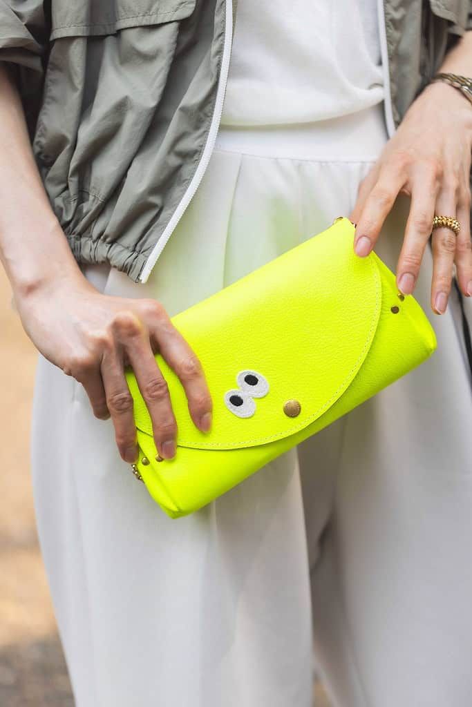 ビタミンカラーは、春になると必ず取り入れたくなるカラーです。アクセントになっているポップな目のモチーフとビビットなイエローは、ホワイトコーデに映えると思い選びました。コンサバ系のキレイめな洋服を着る時はカジュアルな羽織ものやバッグを選び、遊び心をプラスするコーデが好きです。