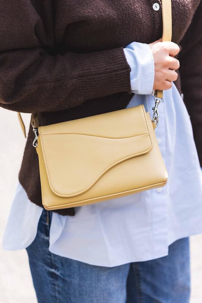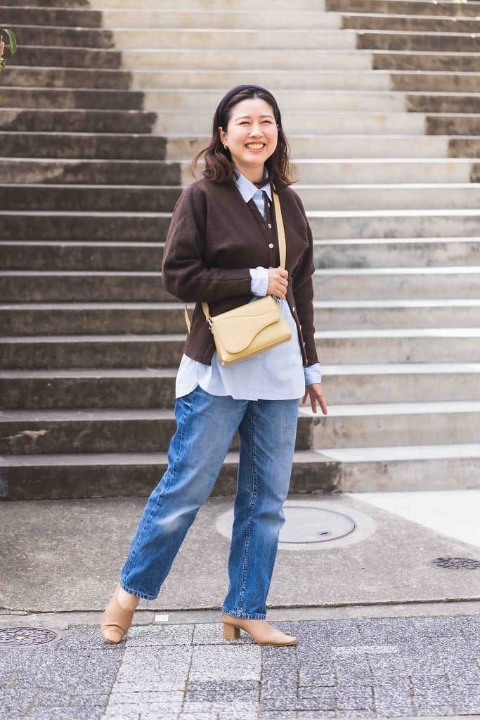 やわらかなイエローバッグは通年通して使える素材で飽きにくく、コーディネートのポイントになると思い購入しました。春先の少し寒い時期でも気分がアガるようなシャツをメインに、デザイン性の高いカーディガンを合わせました。ご近所感をあまり見せないように肌馴染みのよいパンプスを履き、背伸びし過ぎない足元で子どもの送迎をします。