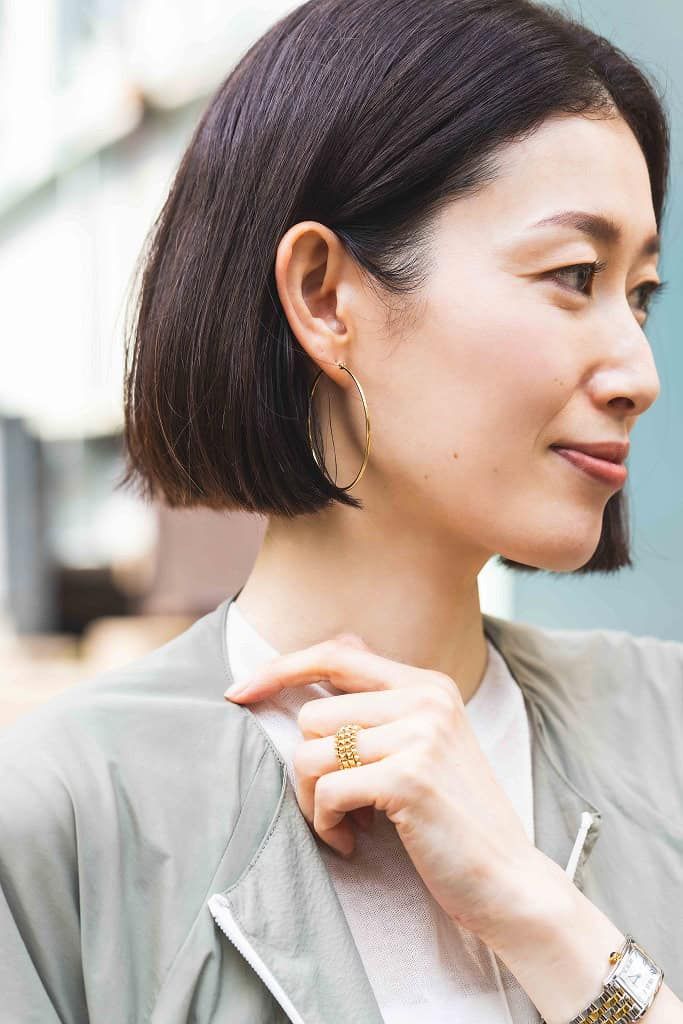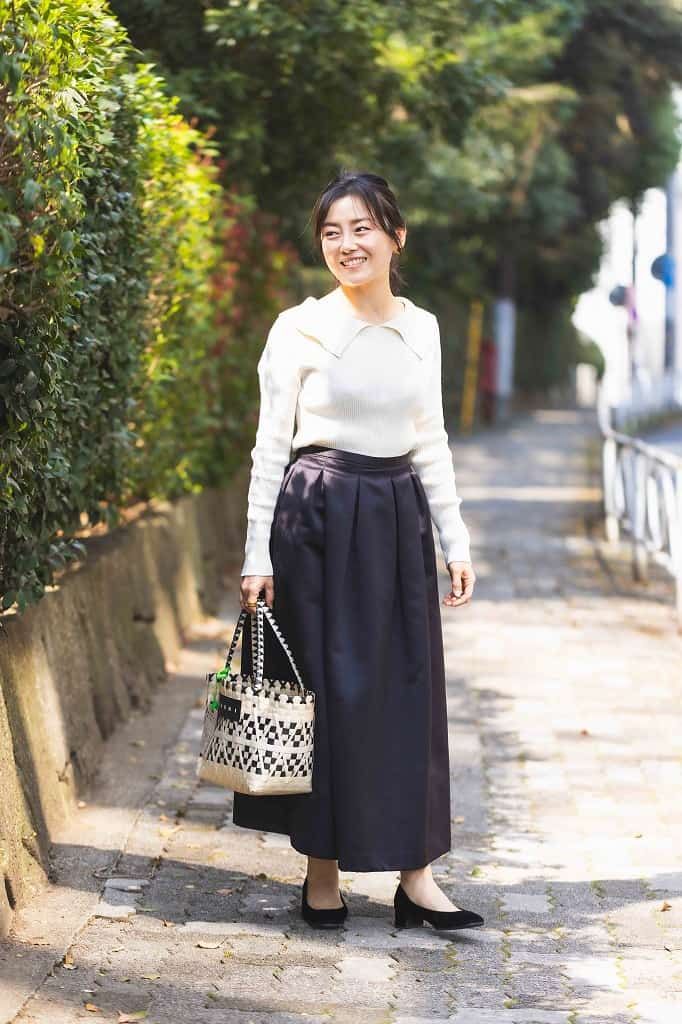 大きめな衿がポイントのトップスは、きちんと感がありママ友との集まりでも印象がよくなりそう。光沢がある素材のスカートは生地にハリがあるので、ずっとキレイなラインを保ってくれます。軽くて持ちやすいデイリーに使える鞄は、春夏らしい素材がお気に入り。モノトーンのバッグに合わせて、アクセサリーもブラック一択で決まりです。