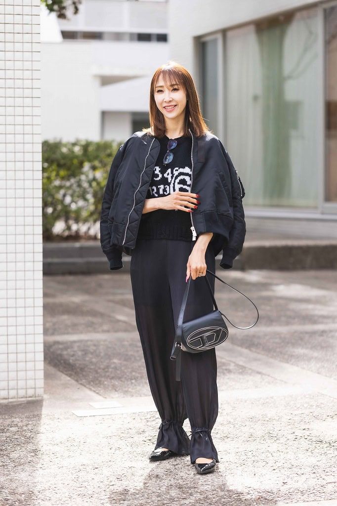 SNSで海外セレブたちがディーゼルのロゴが大きなバッグを持っているのを見て購入しました。トップスのマルジェラのロゴをアクセントに、透け感のあるパンツとアウターのシルエットでメリハリを出しました。パンツの裾を縛ったデザインは、ママ友からも褒められるアイテムです。歩くたびにかかとからのぞく赤いハートのストラップで甘さをプラスしました。