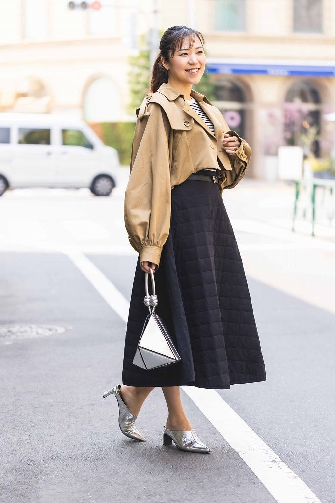 シルバーカラーのバッグは、どんな服にもマッチするスタメンバッグです。ボディ部分の形が変化する2way仕様でベーシックなカラーのお洋服でもアクセサリー感覚で持てます。ショート丈トレンチは、ロングスカートとバランスよく着れてお気に入り!プラダのベルトでウエストマークをすることで、コーデを引き締め足長効果を期待しました。