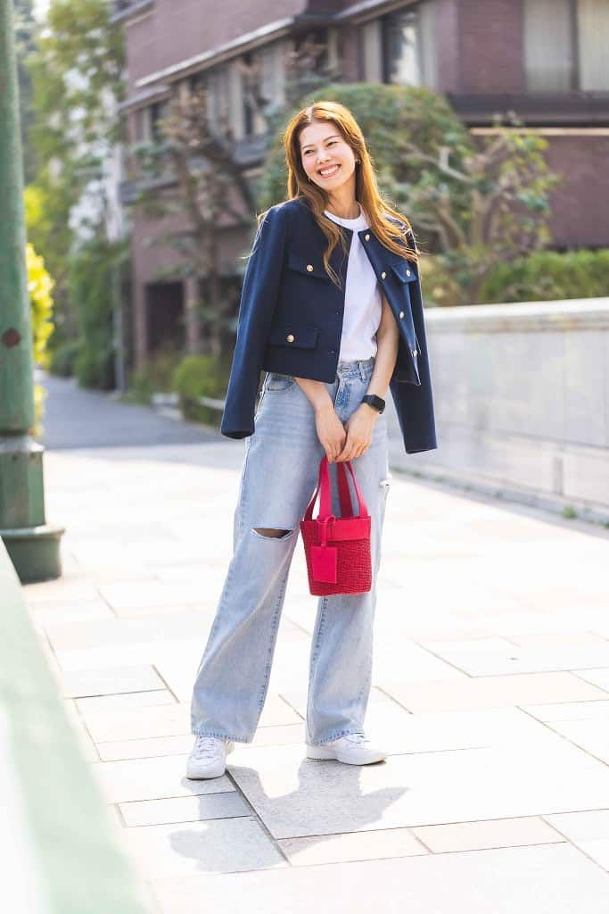 真っ赤なカゴバッグは人と被る率が低くアクセントにもなるので、アクセサリー感覚で持ちます。今日のコーデはなんだか決まらないなと思ったとき、赤を入れることで一気にコーデを引き締めてくれる救世主的存在です。コーデはバッグの元気な赤のテンションに合わせ、デニムにTシャツ、スニーカーでアクティブに見せながらジャケットを羽織り、大人カジュアルにまとめました。