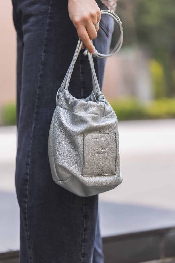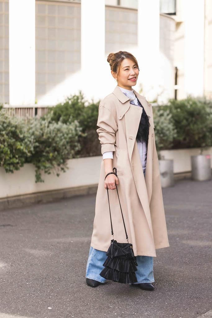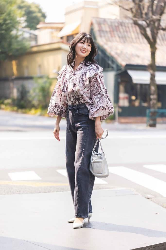 デザインがシンプルな巾着バッグは、シャープな輝きを放つシルバーで冒険しました。トップスは春に着たい甘めのフリルブラウスで顔まわりを華やかにし、フェミニンな雰囲気をジーンズで程よくカジュアルダウンしました。足元はシルバーバッグに合わせて同色のパンプスを合わせ、子どもの送迎後、急なモーニングのお誘いにも対応できるようにしました。