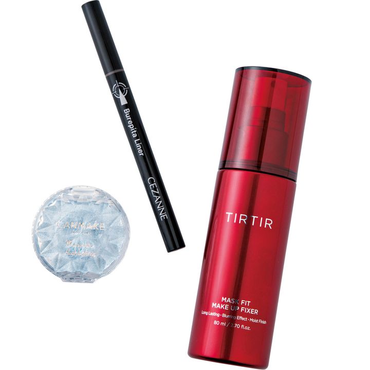 左:キャンメイクのむにゅっとハイライター 04は、少量で濡れたようなキレイなツヤが出ます。母もクオリティが高いと大絶賛してくれて、ふたりで愛用中です。中:アイラインがうまく描けないと悩んでいた母が、ストレスフリーで描きやすいと感動してくれたセザンヌのブレぴたライナー 10。右:パンダ目になるのが悩みだった母にすすめた、TIRTIRのマスクフィット メイクアップフィクサー。シュッとスプレーすれば、ファンデやチークだけでなく、アイメークもしっかりキー プしてくれます。