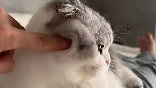 飼い主さんが人差し指をそっとほっぺにムニッ。