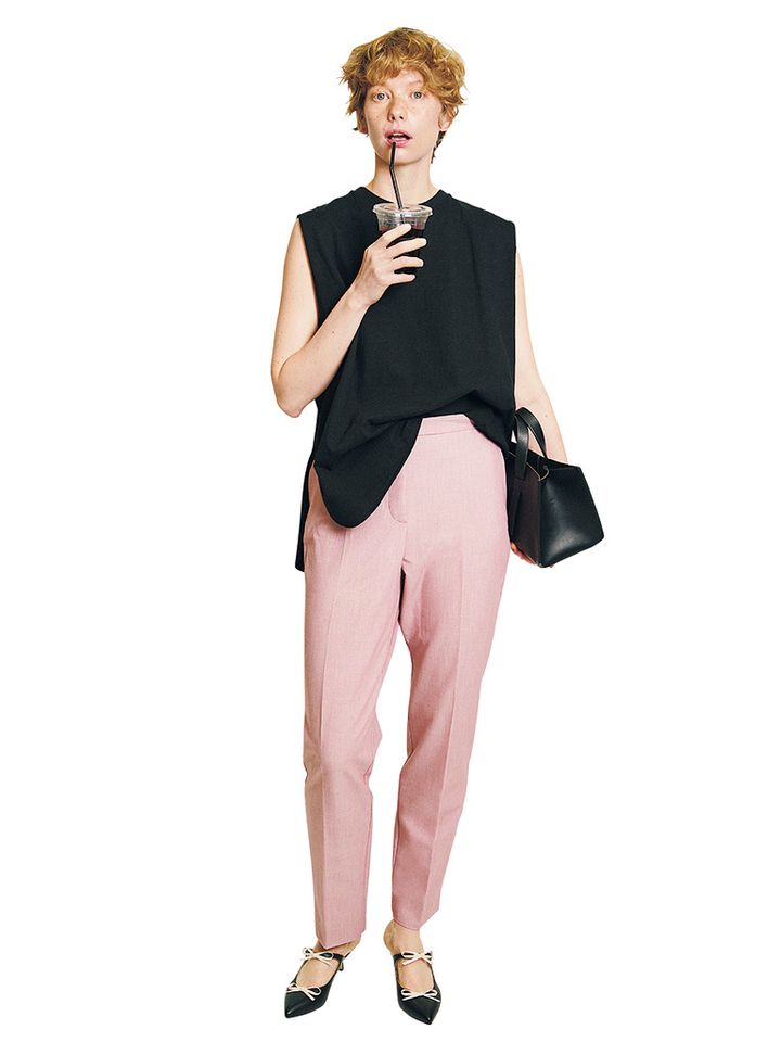 ピンクテーパードパンツ/MANGO 黒タンクトップ/サクラ(インターリブ) 黒バッグ/アレスタジオ(ギャルリー・ヴィー 丸の内店) 黒リボンミュール/ダイアナ(ダイアナ 銀座本店)