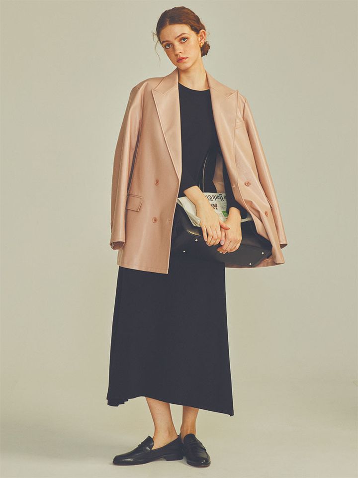 「まじめすぎる」「無骨すぎる」といった、レザー素材やテーラードジャケットの緊張感を中和させる、やさしいサーモンピンク。いろんな服と合わせやすいマイルドな色みに加え、クールな印象を保てるカドのあるフォルム。ボタンまで同色でそろえることで、カラーアイテムであってもシンプルな表情がくずれない。