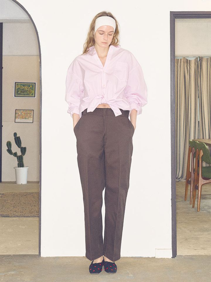 ピンクシャツ/エイトン(ATON AOYAMA) ブラウンチノパンツ/ディッキーズ 白ヘアバンド/アネモネ (サンポー クリエイト) フ ラットシューズ/PIPPICHIC(ベイジュ)