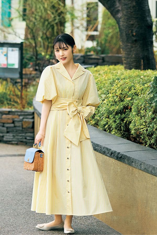 美発色なイエローやウエストのリボンできれいめワンピに今年らしい華やぎをトッピング