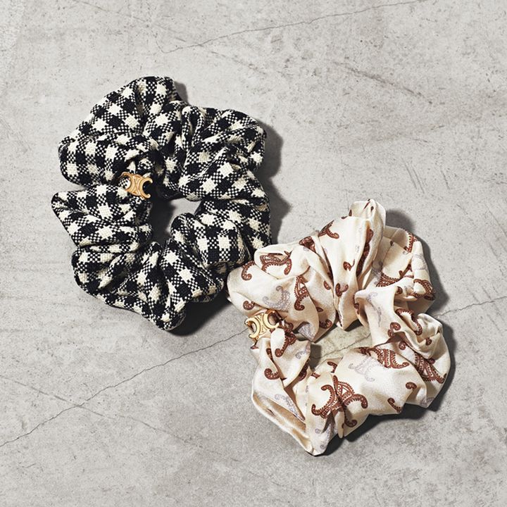 柔らかい布素材のシュシュにキラッと存在感のあるトリオンフが目を惹く。右からシュシュ¥44,000シュシュ〈SCRUNCHY〉¥51,700※ともに予定価格(ともにセリーヌ バイ エディ・スリマン/セリーヌ ジャパン)